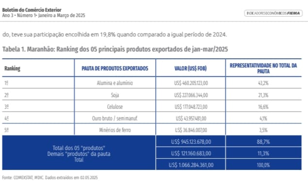 De acordo com estudo divulgado pela Federação das Indústrias do Maranhão (Fiema), nos três primeiros meses deste ano, as exportações do Maranhão para o mercado internacional superam a cifra de US$ 1 bilhão, e o grande destaque fica para a Alumar, que responde com US$ 462 milhões nas exportações de alumínio e alumina.