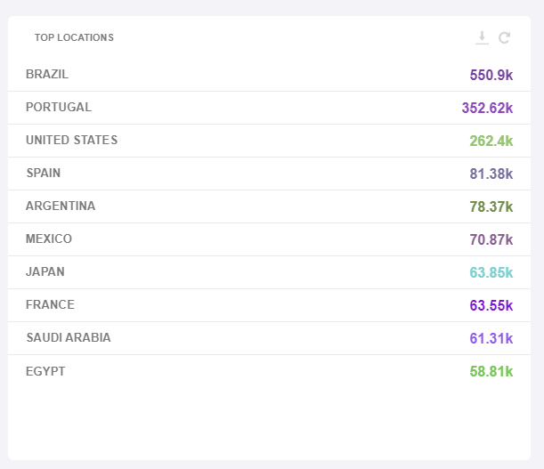Já no monitoramento realizado pela plataforma sobre países, os três que mais mencionaram Neymar Jr. foram o Brasil (558.7k), Portugal (358.03k) e os Estados Unidos (266.09k).