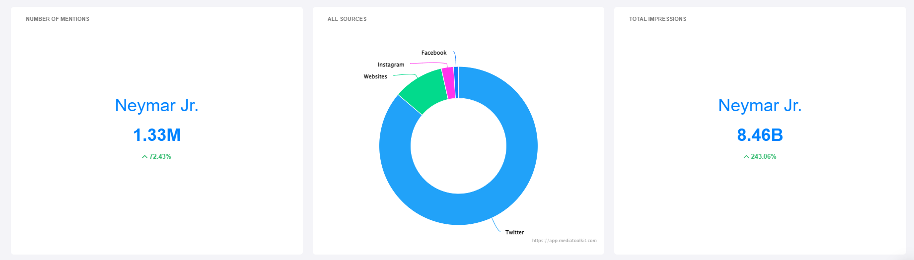 No Twitter, foram mais de 1 milhão e 165 mil menções, enquanto no Instagram e no Facebook foram mais de 33 mil e 13 mil, respectivamente. Em sites ao redor do mundo, seu nome foi mencionado quase 140 mil vezes. No total do levantamento deste período, mais de 8 bilhões de páginas e perfis foram atingidos, de alguma forma, uma ou mais vezes, pelo assunto ‘Neymar’.