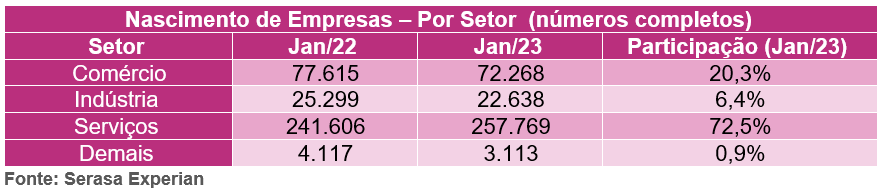 Dados do Indicador de Nascimento de Empresas da Serasa Experian revelaram que, em janeiro deste ano, o setor de Serviços alcançou um recorde com 257.769 negócios criados. Essa é a maior quantidade desde 2010, início da série histórica do índice.