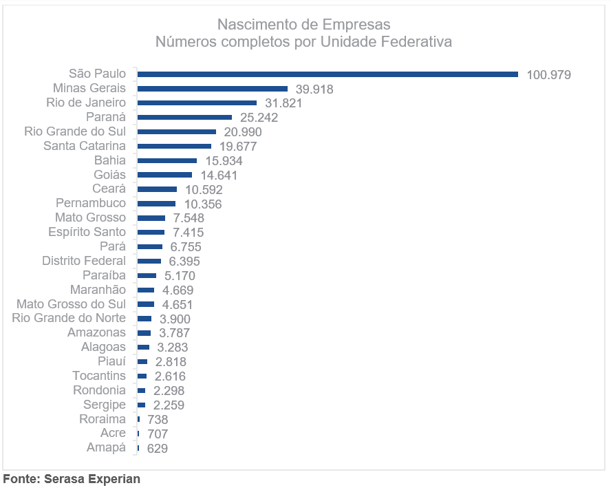 Metodologia – Para o levantamento do Nascimento de Empresas foi considerada a quantidade mensal de novas empresas registradas nas juntas comerciais de todas as Unidades Federativas do Brasil, bem como a apuração mensal dos CNPJs consultados pela primeira vez à base de dados da Serasa Experian.