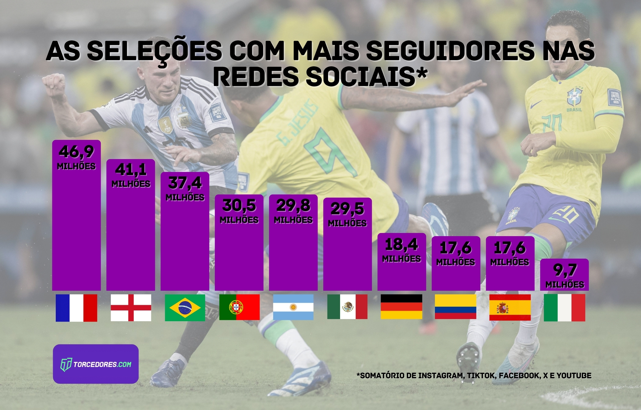 Protagonista do clássico com o Brasil, a Argentina é a quinta seleção do mundo mais popular nas redes sociais. Perde não apenas para França, Inglaterra e Brasil, como também para Portugal, por uma diferença bem pequena: são 30,5 milhões seguindo os portugueses, contra 29,8 milhões acompanhando os argentinos.