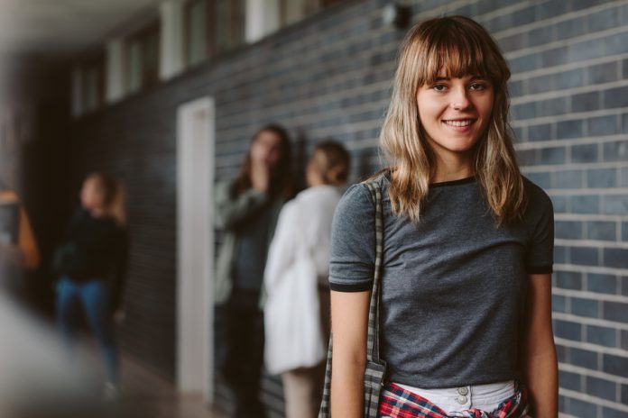 Portrait of beautiful young woman walking in college corridor with students standing in background. Female student in university campus.
