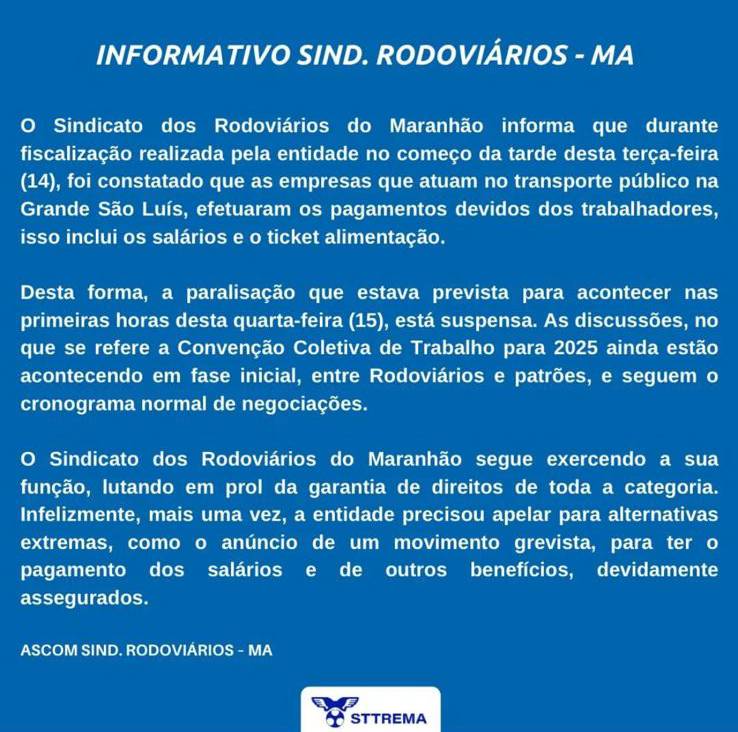 Em nota divulgada na tarde desta terça-feira (14), o Sindicato dos Rodoviários do Maranhão informou na fiscalização realizada pela entidade foi constatado que as empresas que atuam no transporte público na Grande São Luís efetuaram os pagamentos devidos dos trabalhadores, isso inclui os salários e o ticket alimentação. Diante dessa constatação, fica descartado o movimento paredista que estava previsto para ocorrer a partir desta quarta (15).