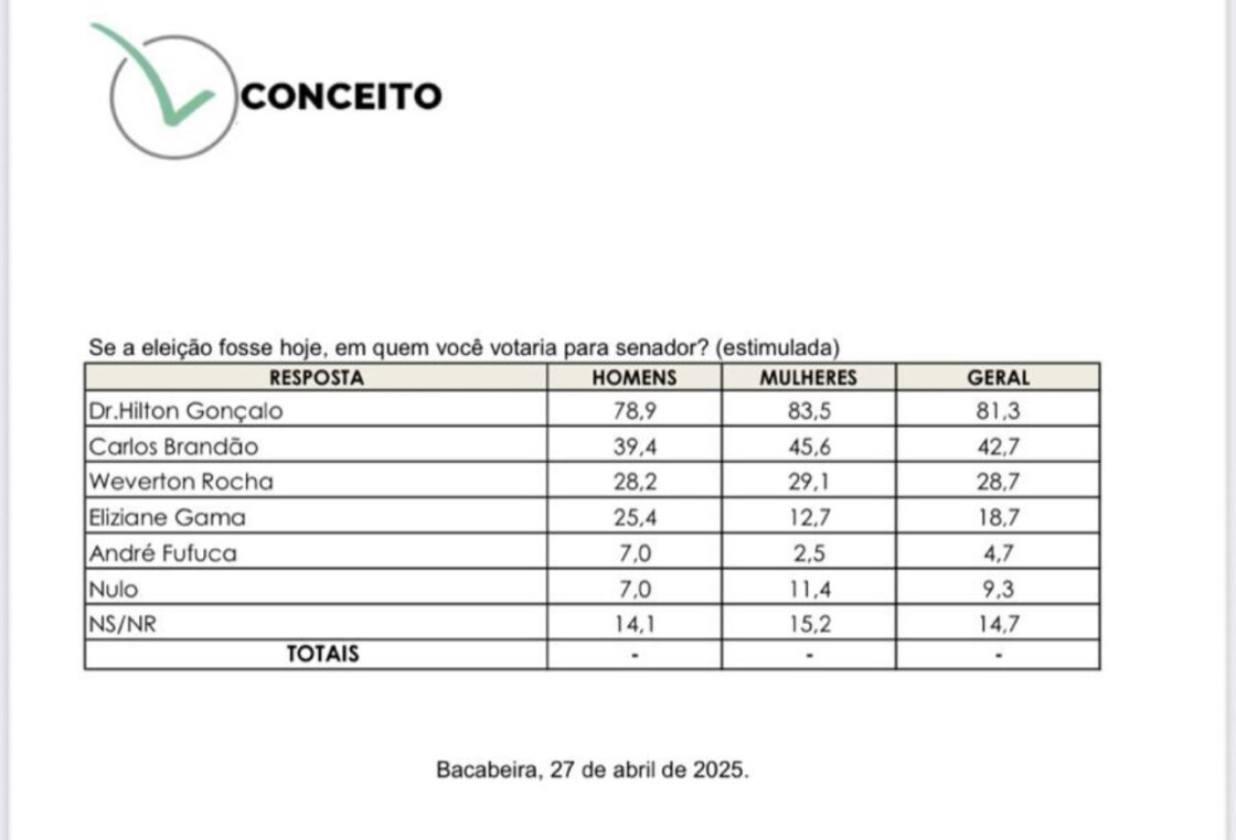 Um novo levantamento realizado pelo Instituto Conceito, feito em 27 de abril de 2025, confirma a liderança do ex-prefeito de Santa Rita Dr. Hilton Gonçalo na disputa pelo Senado no Maranhão nas cidades de Bacabeira e Santa Rita. Se as eleições fossem hoje, ele teria 81,3% das intenções de voto entre os eleitores de Bacabeira. Já em Santa Rita, o ex-prefeito apresenta 83,3%.