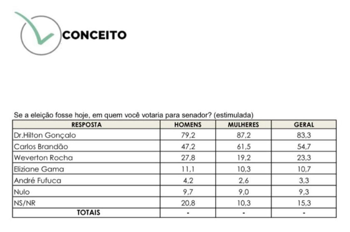 Na sequência, Weverton Rocha aparece com 23,3% no geral, seguido por Eliziane Gama (10,7%) e André Fufuca (3,3%). Votos nulos ou brancos somam 9,3%, enquanto 15,3% dos entrevistados afirmaram não saber ou preferiram não responder.