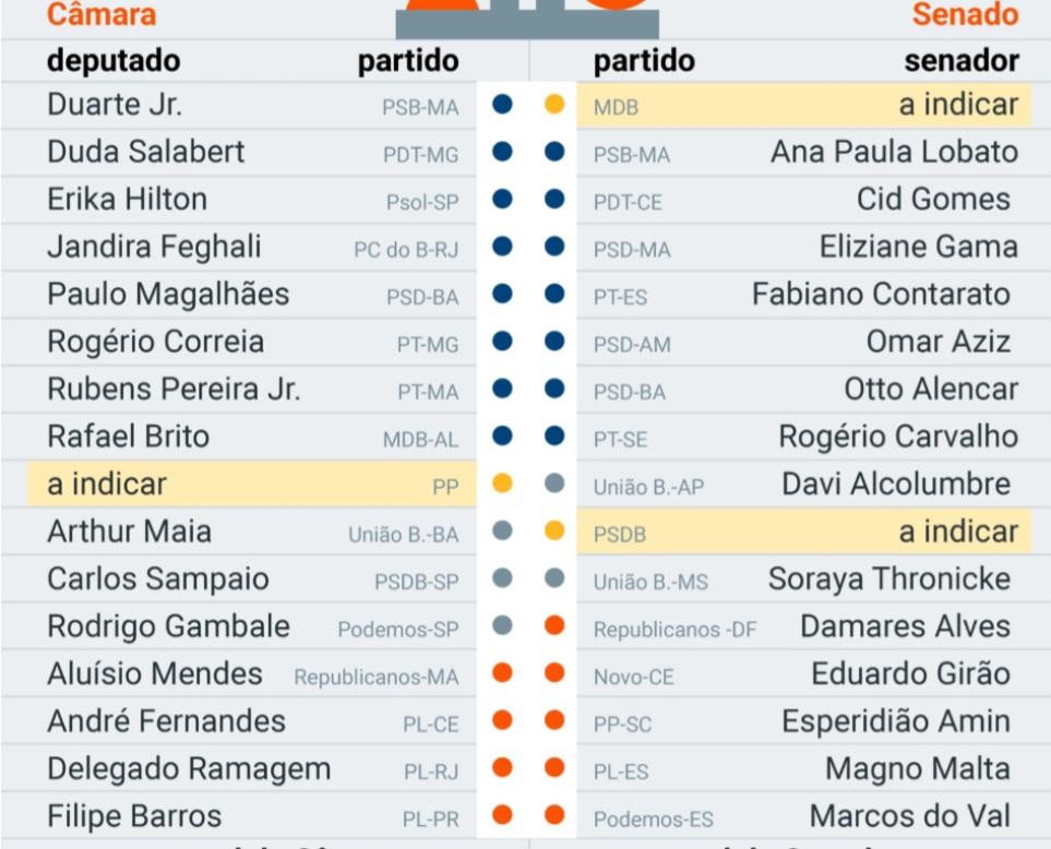 Ainda Faltam três indicações: uma do PP, na Câmara, e uma do MDB e outra do PSDB, no Senado.